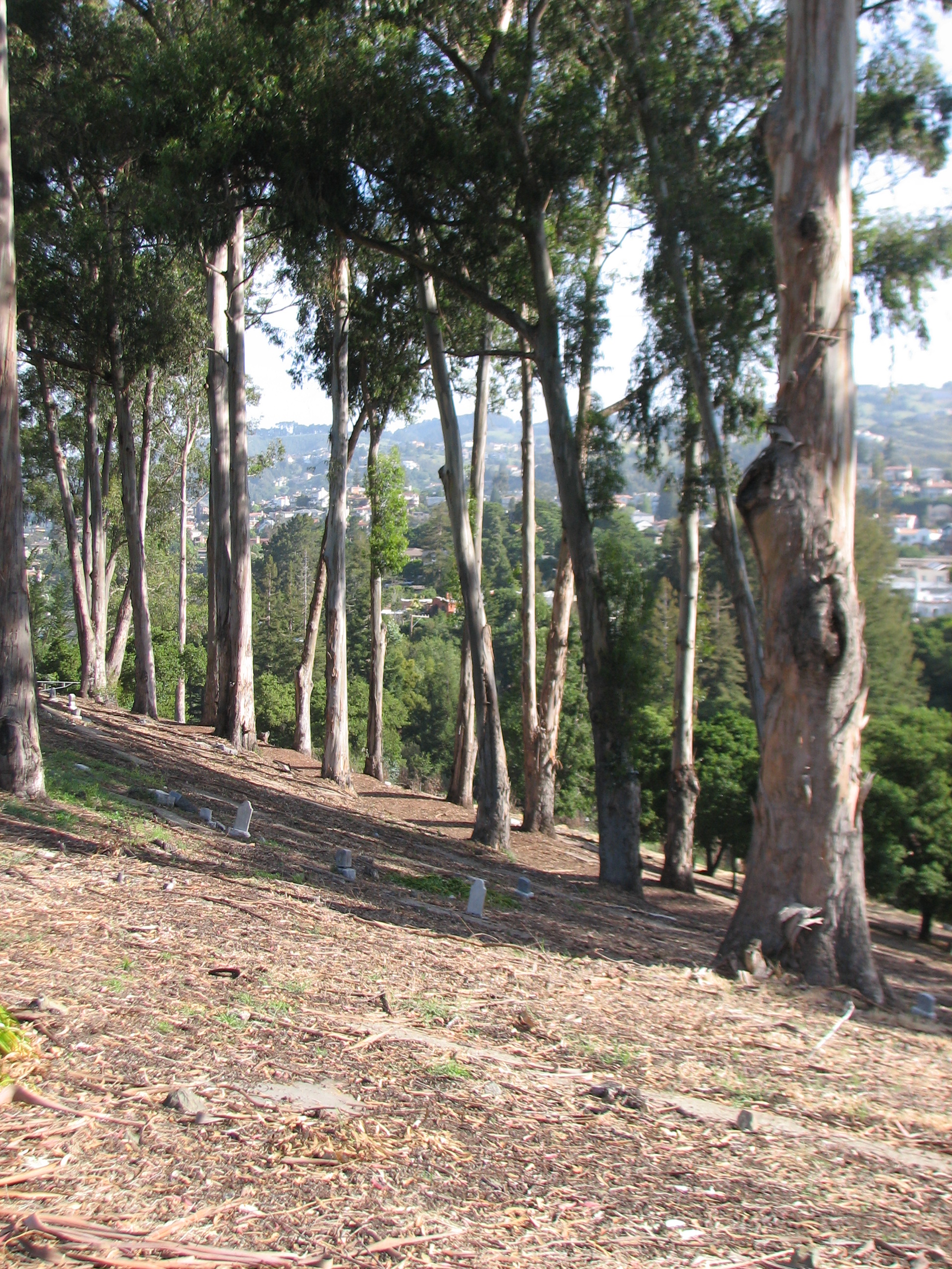 When tall trees, such as eucalypts have a fire ladder to their canopy, their lower limbs can be removed without harming the tree.  This method of reducing fire hazard has been used effectively in the Mountain View Cemetery in Oakland.  Obviously, this method of reducing fire hazard is cheaper and less destructive than destroying the trees and then killing their roots with poison.  This was one of the strategies suggested by the Hills Conservation Network during negotiations with EBRPD before they filed suit after negotiations failed.