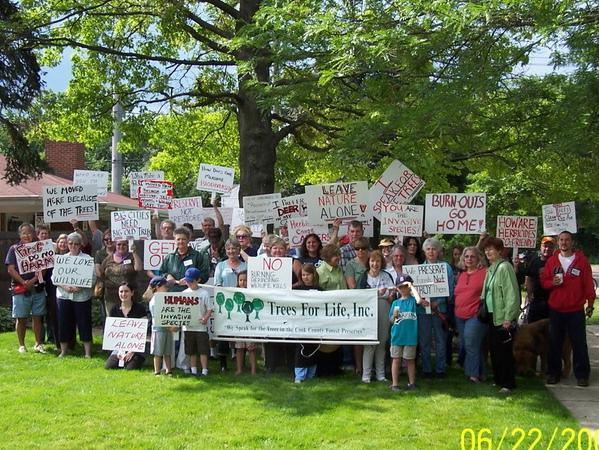 Since this photo was taken, the managers of public land have quit announcing prescribed burns and  work days in advance, hoping to prevent crowds such as this from gathering in protest.  Keeping their eyes and ears open, the critics gather as quickly as they can when they learn of a burn or a work day.