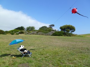 Multiuse recreation at Cesar Chavez Park: a panda flying a kite