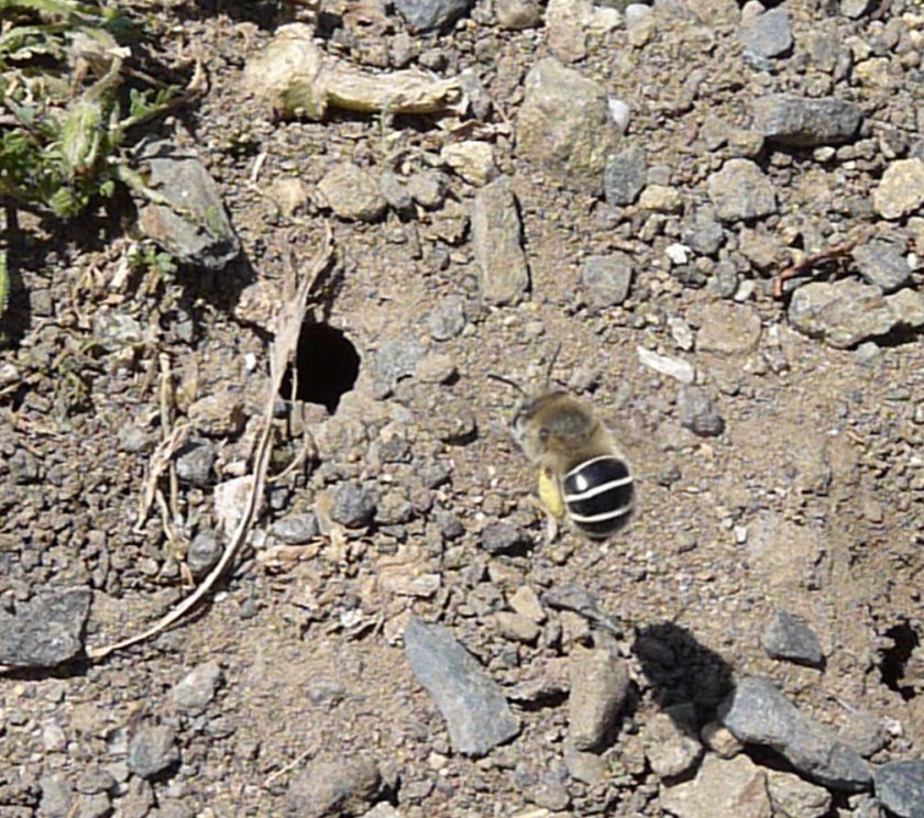 Next Image Native bee at Albany Bulb2 Native bee (Anthrophora urbana) approaching nest in ground at Albany Bulb