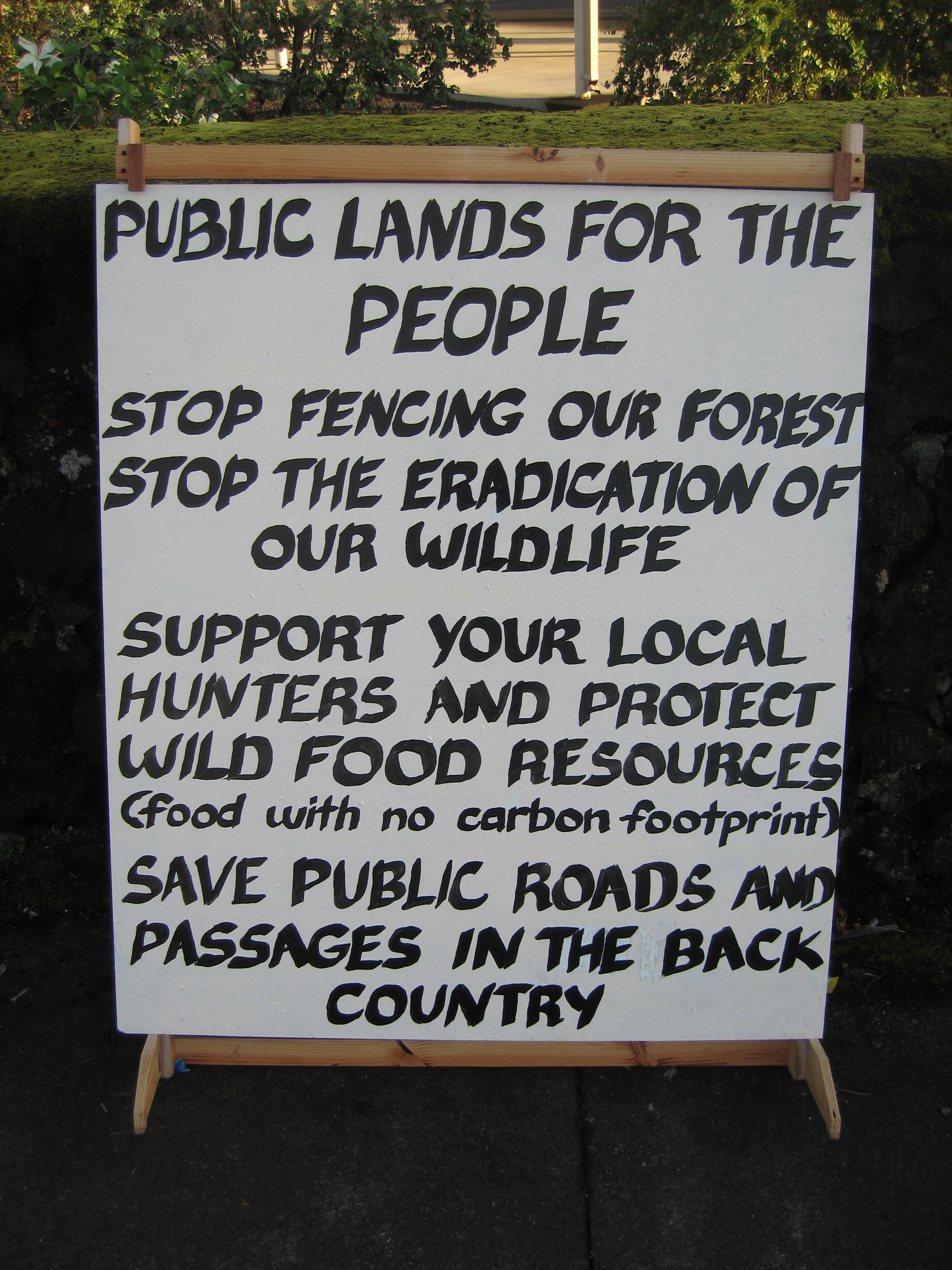 We recently told our readers about the controversial “restoration” projects in Hawaii. Now our colleagues in Hawaii have sent us photographs of a public protest in Hawaii and The Hawaii Reporter tells us why they are protesting. Hawaii’s Department of Land and Natural Resources (DLNR) is fencing the public out of another 17 square miles of prime forest on the Big Island. All the non-native animals—sheep, goats, pigs—will be exterminated and all their non-native food—strawberry guava, passion fruit, etc—will be eradicated in that fenced enclosure. The people who hunted the animals and gathered fruit in the forest are protesting the loss of this source of food.