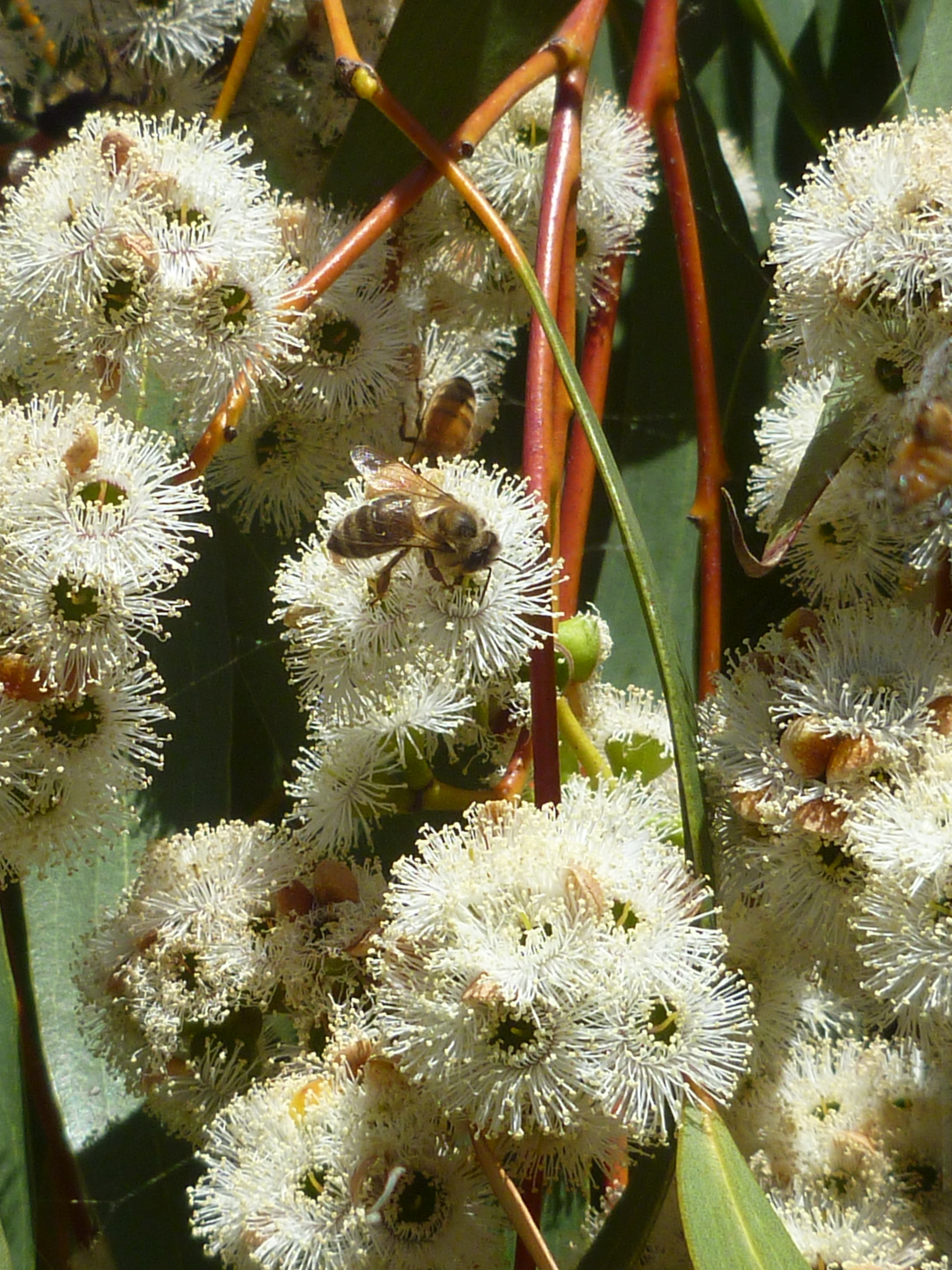 There are several eucalyptus trees in the garden, but one is a stand-out. The ghost gum (Eucalyptus pauciflora) is aptly named for its white bark. Coincidentally its ancestral home is the Snowy Mountains in Australia where it is often found standing in the snow. It is one of the few cold-tolerant species of eucalypts. Our opinions of eucalypts are heavily influenced by one particular species, the blue gum eucalyptus, because it is the predominant eucalypt in California. We often forget that there are actually 700 species of eucalyptus and therefore there are a wide variety of forms and horticultural characteristics. The ghost gum in the Bancroft Garden was flowering and swarming with bees collecting pollen and/or nectar. The flowers were close to the ground so we were able to confirm that the nectar was not at all sticky, as critics of eucalyptus often claim.