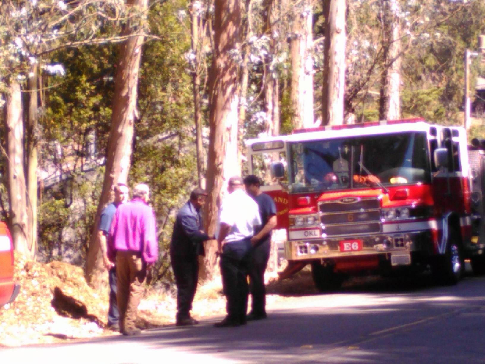 At noon, just down the street from Redwood Regional Park, Oakland Fire Chief Vegetation manager, Vince Crudele, and several firefighters were called to the scene after a neighbor reported that a large mulch pile from a pine tree that was recently cut down had begun steaming. Firefighters hosed down the mulch pile with water to cool it and explained to us that the steam was the result of heat from the composting debris.