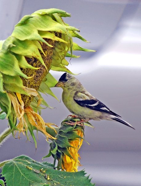 Native Goldfinch with non-native sunflower who provides important seeds for native birds. By Melanie Hoffman.