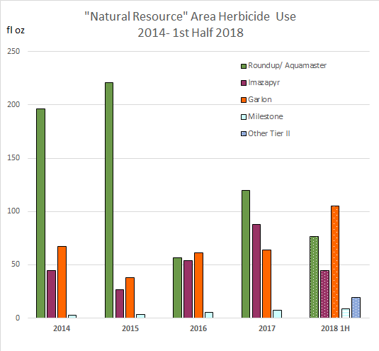 In the Bay Area, one of the oldest native plant “restorations” is in San Francisco, where the so-called Natural Areas Program (now called Natural Resources Division) started in 1998.  They have used pesticides consistently since the program began.  The San Francisco Forest Alliance began tracking their use of pesticides in 2008.  In their most recent report, the Forest Alliance informs us that pesticide use in the so-called “natural areas” has increased significantly in the first half of 2018.  This increase was anticipated because the program plan and its Environmental Impact Report were finally approved in spring 2017, after 20 years of being hotly contested.  The approval of the program enabled them to increase the staff of pesticide applicators from one to five.  Most of the increase in pesticide use in 2018 is of Garlon, one of the most toxic pesticides available on the market.  San Francisco’s native plant restorations are a specific example of the long term use of large quantities of herbicide.  You can visit those areas to see for yourself that 20 years of effort and herbicides have not successfully established native plant gardens.