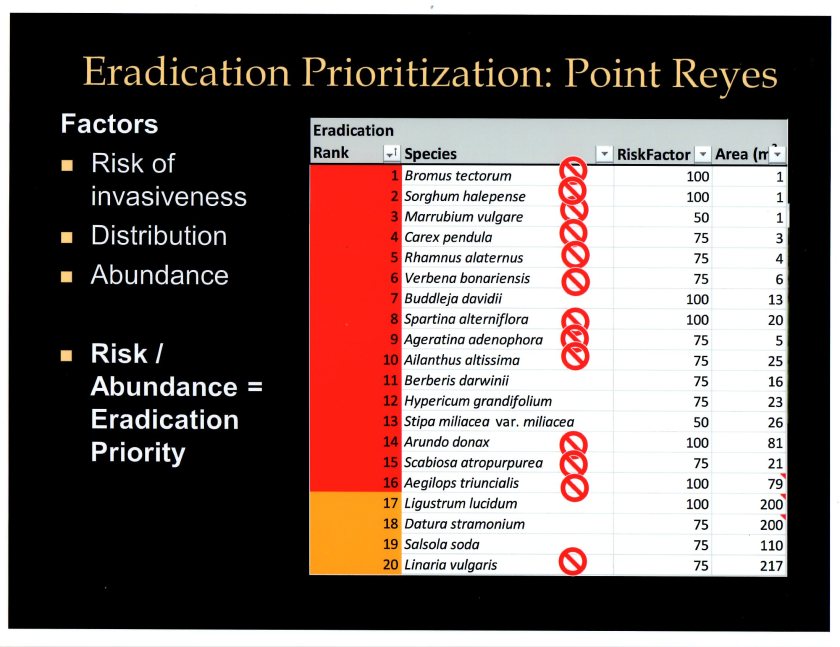 This is the list of eradication projects in the National Parks in the Bay Area that was presented at the conference of the California Invasive Plant Council. The projects marked with the red symbol for crossing out are completed projects. Nearly half of the plants on this hit list are not considered invasive in California.