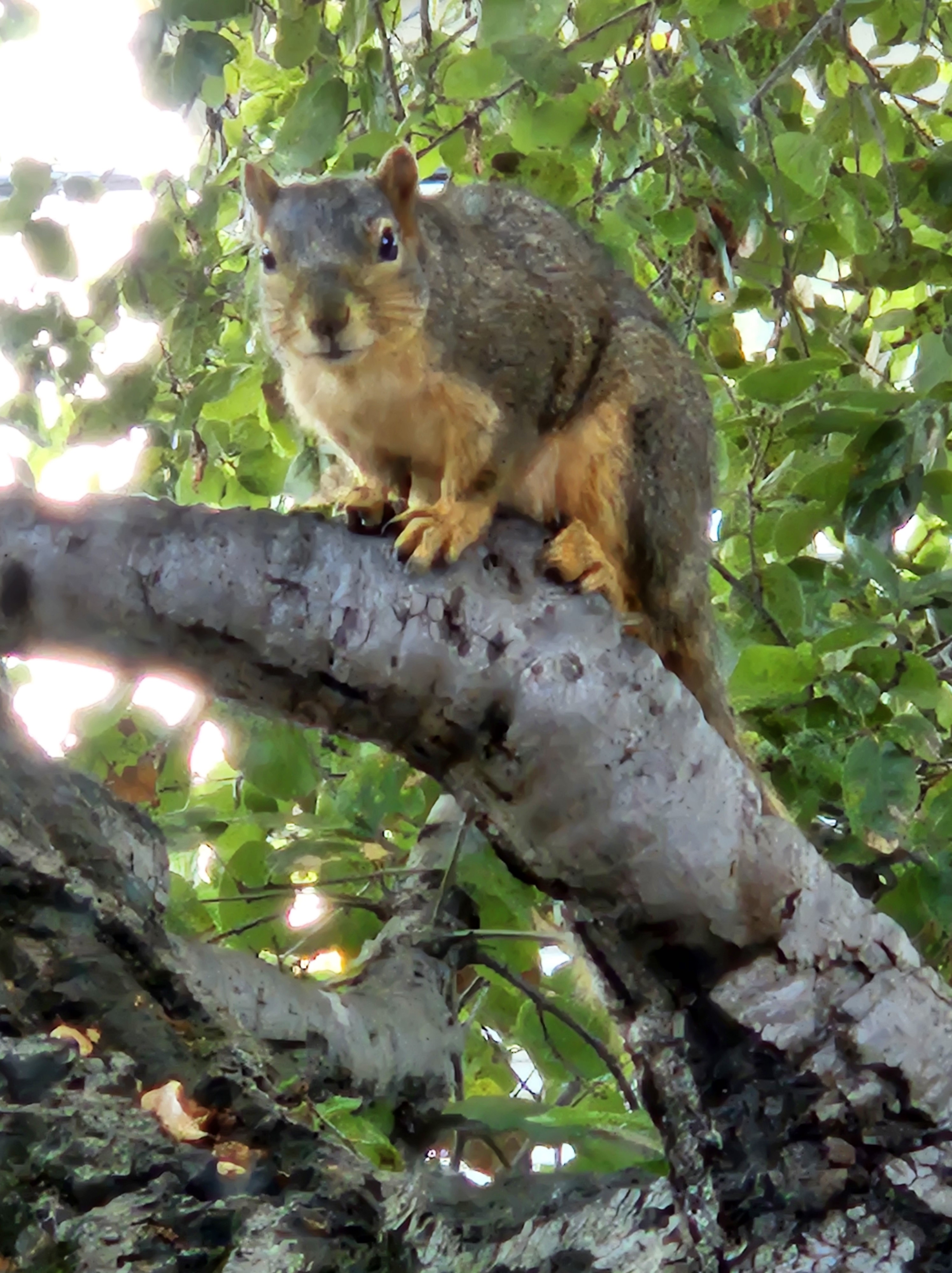 We have always had a big population of squirrels in our neighborhood, probably because we have many big trees, including our coast live oak. Oaks in California had a big mast year in 2021, which means they produced many more acorns than usual. The population of squirrels increased significantly, which is typical of mast years.