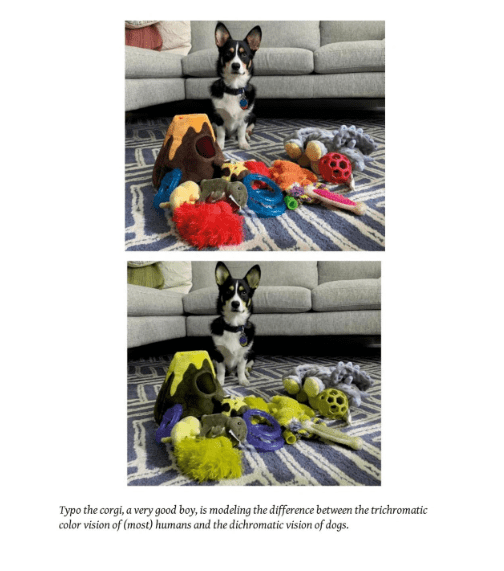 Dogs and many other animals can see only two colors: blue and yellow. About 8% of men and .5% of women are red-green color blind. Their perception of color is the same as dogs. This picture from An Immense World shows the difference between perceiving two compared to three colors: