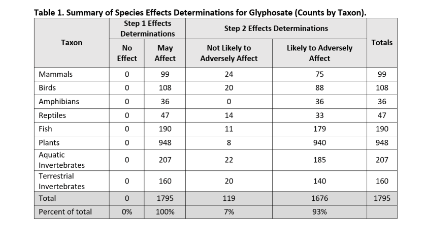 The Endangered Species Act requires that the Environmental Protection Agency (EPA) conduct biological evaluations (BE) of the impact of pesticides on threatened and endangered species protected by the ESA. For example, when the EPA published its final evaluation of glyphosate in 2021, it informed us that glyphosate is “likely to adversely affect” 93% of legally protected endangered and threatened plants and animals.