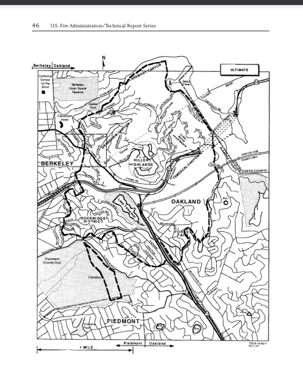 FEMA identified the sources of fuel for the fire as follows: “The northeast portions of the fire area had more wildland fuels, while in the south and western areas, the homes were the major fuels. In effect, the more severe slopes in the north and eastern portions of the fire area required the use of native species. The more moderate slopes and deeper soil in the south and southwest areas allowed for the introduction of more ornamental type species.” In other words, FEMA considered native chaparral and the homes themselves the primary fuel source for the fire.
