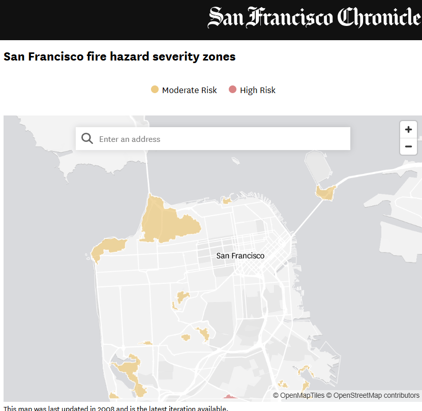 Addendum, 3/1/25: The map of San Francisco pictured below is from a recent Chronicle article about limited fire hazards in San Francisco. Crocker-Amazon neighborhood at the southern border of the city is the only small area considered a “high fire hazard” by Cal-Fire. There are NO “very high fire hazard” zones in San Francisco. New stricter vegetation clearance standards proposed by Governor Newsom applies only to very high fire hazard zones.