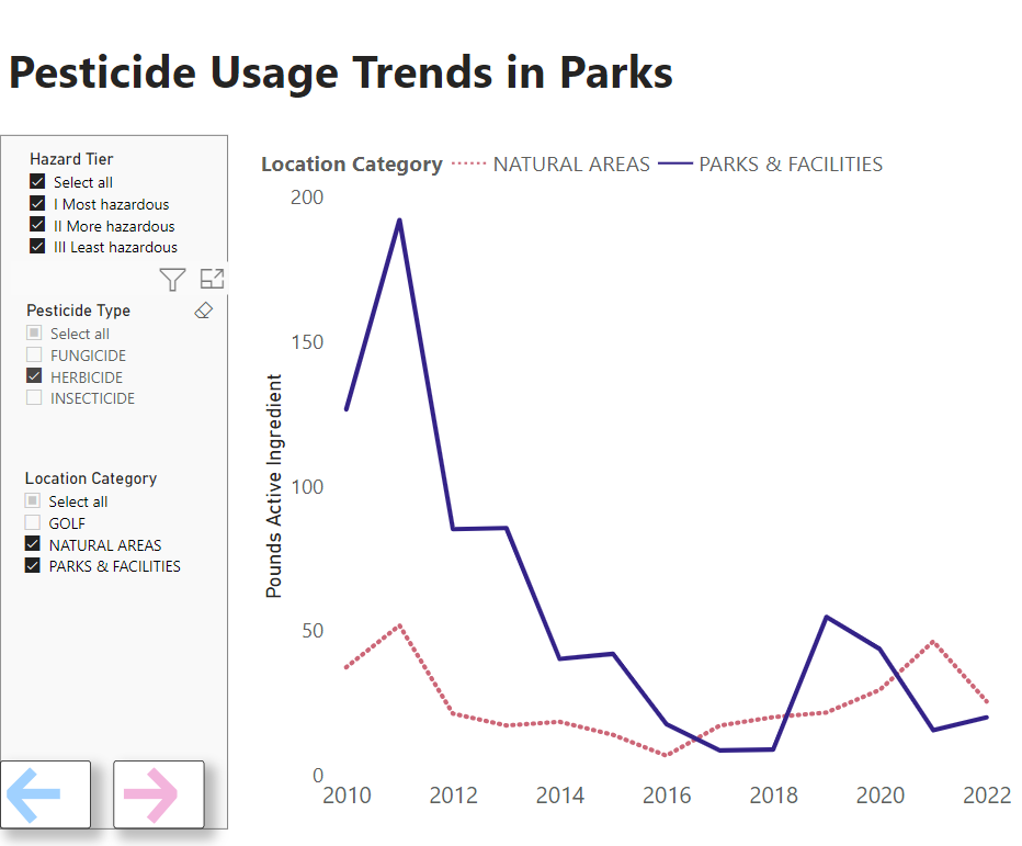 While San Francisco’s Recreation and Park Department has significantly reduced its use of herbicides since 2010, the Natural Resources Division that is responsible for the “natural areas” has not. Natural Resources Division is now using more herbicides than the rest of the parks. Source: San Francisco IPM Program, Department of Environment