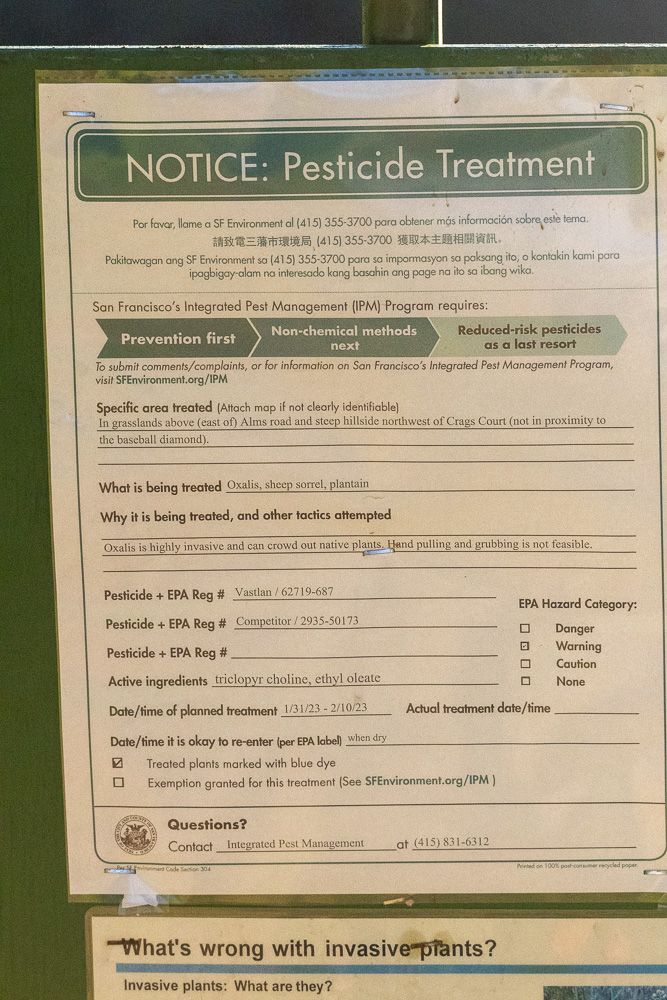 One of many pesticide application notices on oxalis in Glen Canyon Park in February 2023.