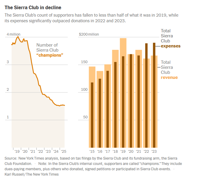 Changes in the leadership of the San Francisco Bay Area chapters of the Sierra Club are symptomatic of the Club’s much broader decline on a national scale. According to the New York Times, the Club has lost 60% of the 4 million members it had in 2019. The Times attributes this loss of support to the change of the Club’s advocacy focus from environmental issues, most prominently climate change, to progressive social justice issues such as racial justice, gay rights, labor rights, and immigration rights. In 2019, one of the Board Directors objected to the proposed budget, but was voted down: “I said, ‘We have two F.T.E.s devoted to Trump’s war on the Arctic refuge, and we have 108 going to D.E.I., and I don’t think we have our priorities straight,’” Mr. Dougherty said.
