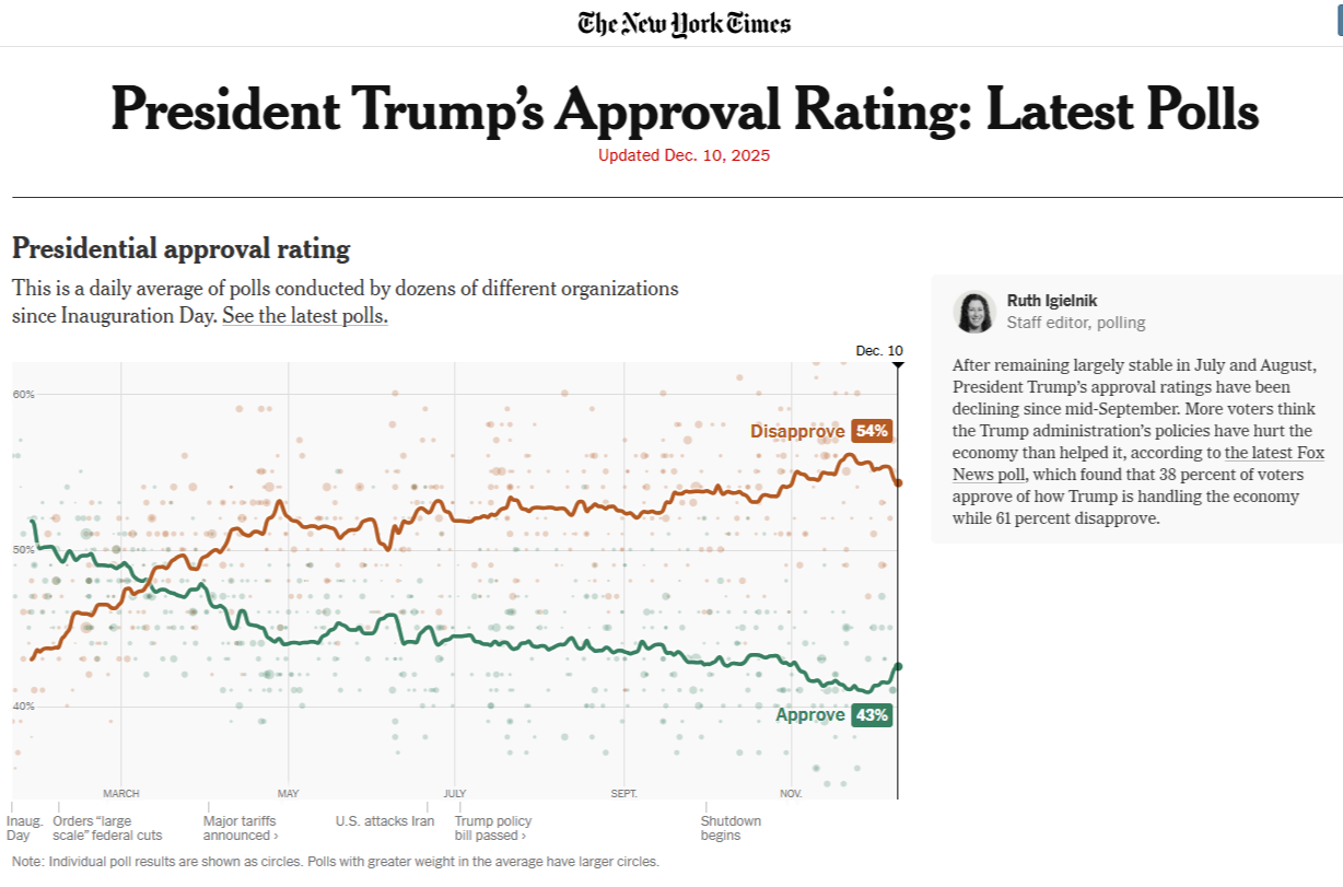 Composite opinion polls reported a persistent negative approval rating of 11% for the Trump presidency until the government shutdown in October, when the approval rating dropped to negative 15% before returning to negative 11% when the government re-opened. Over 40% of American voters still approve of the Trump presidency. Many voters have made up their mind and are not responsive to the daily onslaught of alarming information. I understand and am sympathetic to the public’s dilemma, summarized in a recent social media post: “My desire to be well informed is presently at odds with my desire to remain sane.”