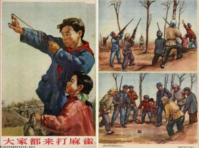 The Four Pests campaign was one of the first actions taken in the Great Leap Forward in China from 1958 to 1962. The four pests to be eliminated were rats, flies, mosquitoes, and sparrows. The campaign depleted the sparrow population nearly to extinction. The sparrows had eaten insects that killed the crops. In the absence of sparrows a plague of locusts contributed to the Great Chinese Famine, killing tens of millions of Chinese between 1958 and 1962. Ironically, the Chinese ended up importing 250,000 sparrows from the Soviet Union to replenish the population.