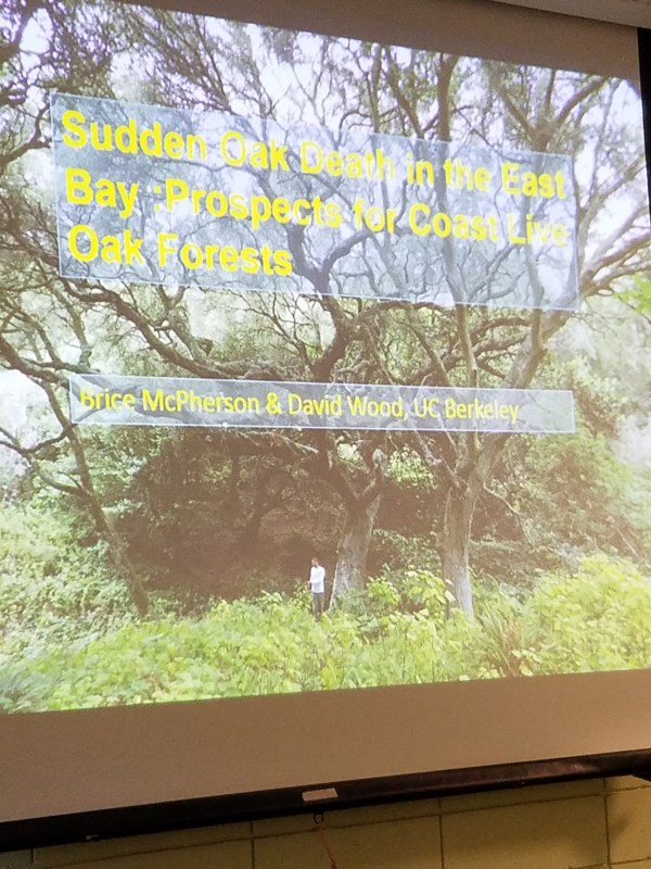 I attended the presentation of Brice McPherson to San Francisco IPM Technical Advisory Committee about Sudden Oak Death (SOD) on Thursday, December 7th. Mr. McPherson is Associate Specialist in “Organisms & the Environment” at UC Berkeley. He has been studying SOD since 2000 and more recently has inventoried the trajectory of the disease in 5 EBRPD parks and conducted experiments in those parks, with the park district’s permission.