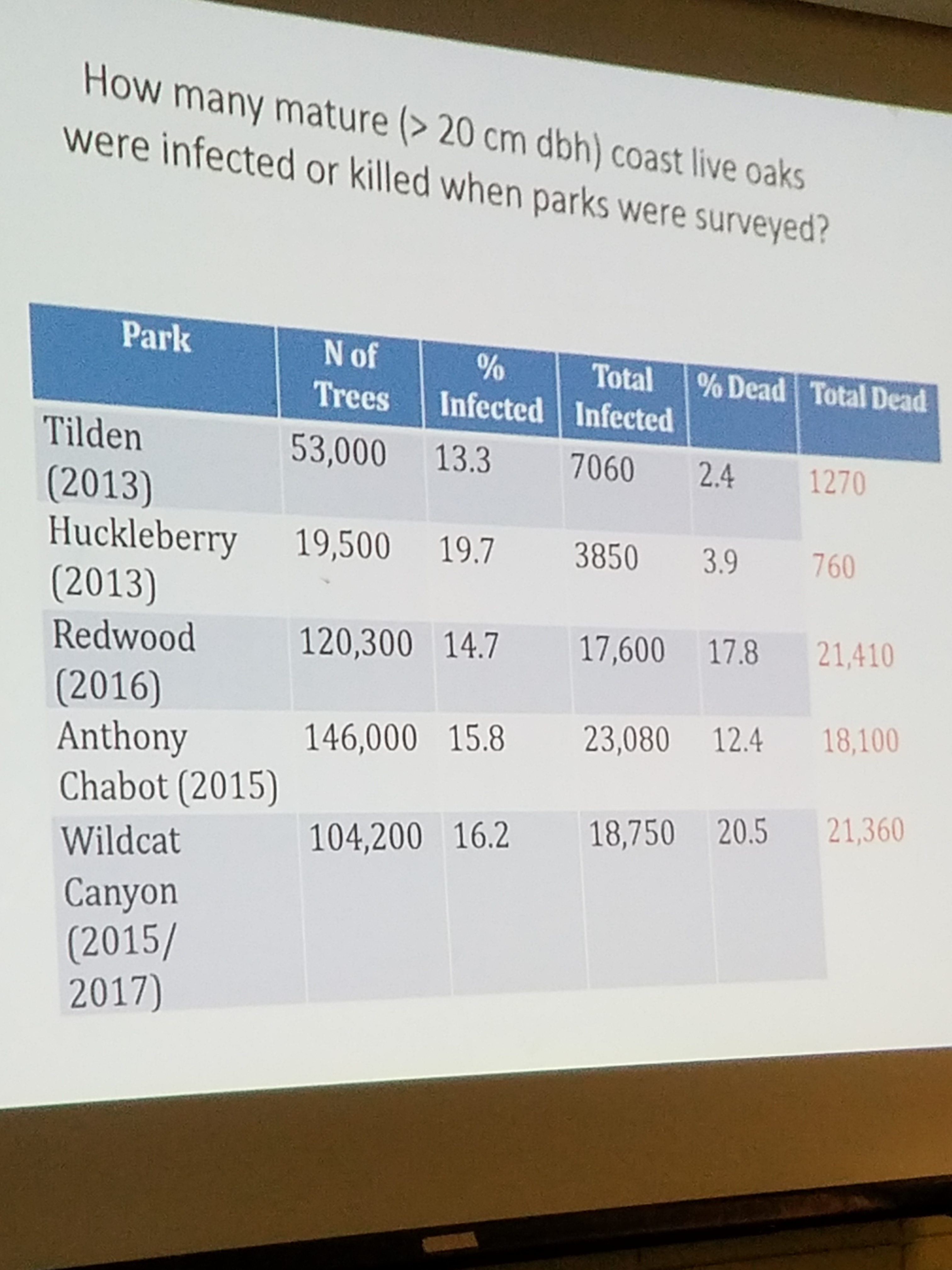 The number of dead and dying trees in the other 4 East Bay parks that Mr. McPherson is studying is smaller. However, his inventories in those parks are much older. Since SOD infections have increased exponentially in 2016 and 2017, we should assume that his data underestimate the current status of oaks in those parks. As you probably know, the pathogen that causes SOD is spread by rain and wind. For that reason, the rate of SOD infections has soared during the past two wet winters.
