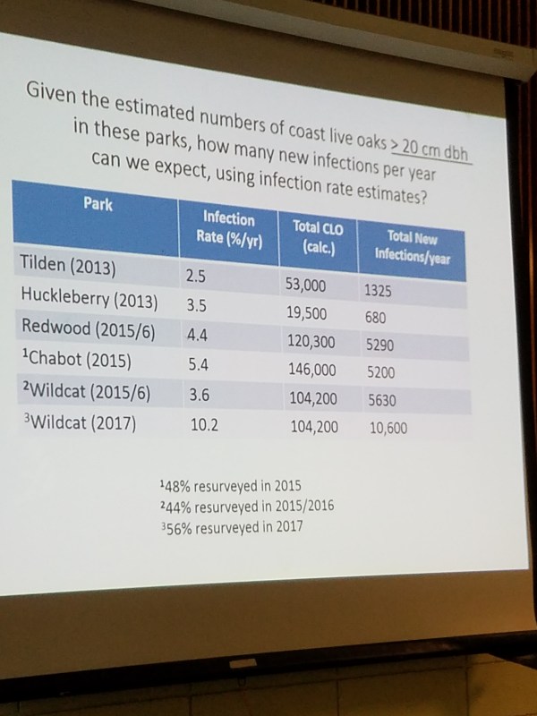 Mr. McPherson predicts that the infection rate in Wildcat Canyon will increase 10.2% per year in the future, causing 10,600 new infections per year. Mr. McPherson predicts that +/- 50% of all coast live oaks will be lost in East Bay parks in the next 20 years, resulting in “major changes in stand structure.” In other words, most oak forests will be replaced by other vegetation types.