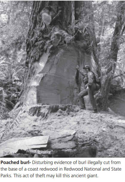 Redwood burls are the tree’s means of recovering from wounds.  The burls have artistic patterns in their wood grain that make them valuable to make furniture, art objects, and veneers for the dashboards of luxury cars.  The tree is damaged by the removal of its burls and is sometimes killed by the damage.