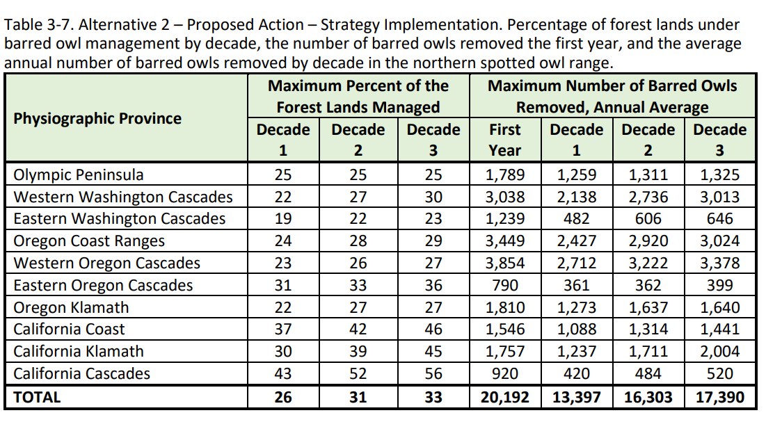 Because the Management Strategy is not mandatory, the total number of birds that will be killed can only be estimated. If all property managers choose to implement the Strategy, approximately 470,000 barred owls would be killed in the next 30 years. Although the Strategy covers only a 30 year time frame, “barred owl management will be required at same level for the long term” because “Their populations will continue to produce young that can disperse within and beyond the current range of barred owls.” (1) The estimated current population of barred owls in study areas of the Management Strategy is only 102,000. Clearly the lethal removal of barred owls is not expected to keep pace with the reproductive success of barred owls. The killing of barred owls will continue forever, although there is no expectation that they will be eliminated.