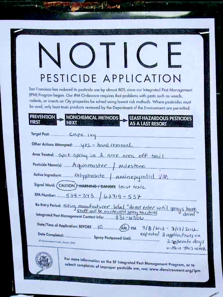 Mixture of glyphosate and aminopyralid sprayed on ivy in Glen Canyon Park, San Francisco