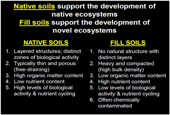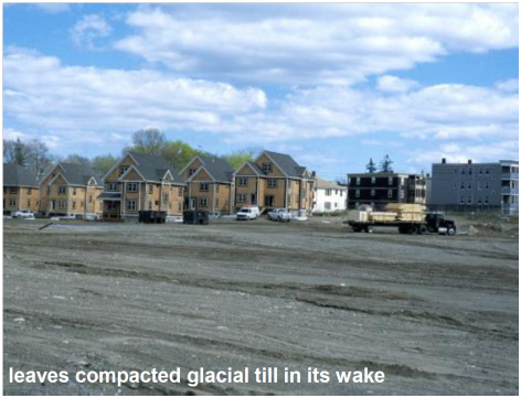 Perhaps the most unique metaphor of all can be found in the picture of a backhoe sitting atop a hill of dirt. The author tells us “The urban glacier [referring to the backhoe] leaves a trail of compacted glacial till in its wake.” A conglomerate of unsorted broken rocks, till does not provide amenable growing conditions for very many species of plants.