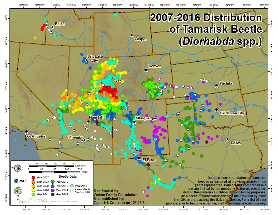 In fact, the introduced tamarisk beetle is working too well. It has spread far beyond the regions where it was introduced and produced wastelands of dead trees in Arizona and Southern California. Since one of the rarest desert birds depends upon tamarisk there isn’t much to celebrate about this over-achiever beetle.