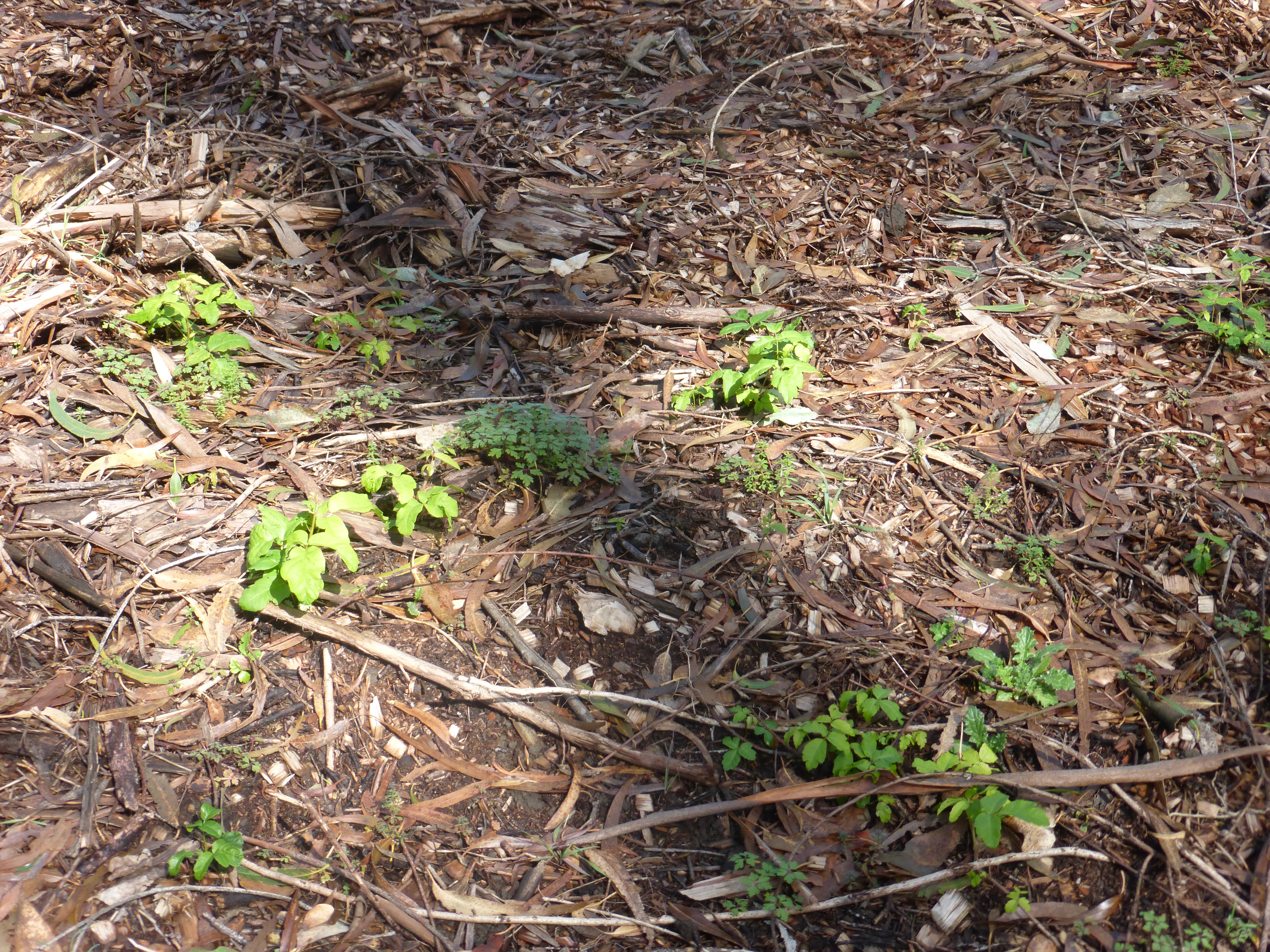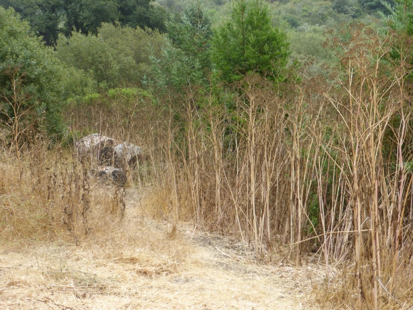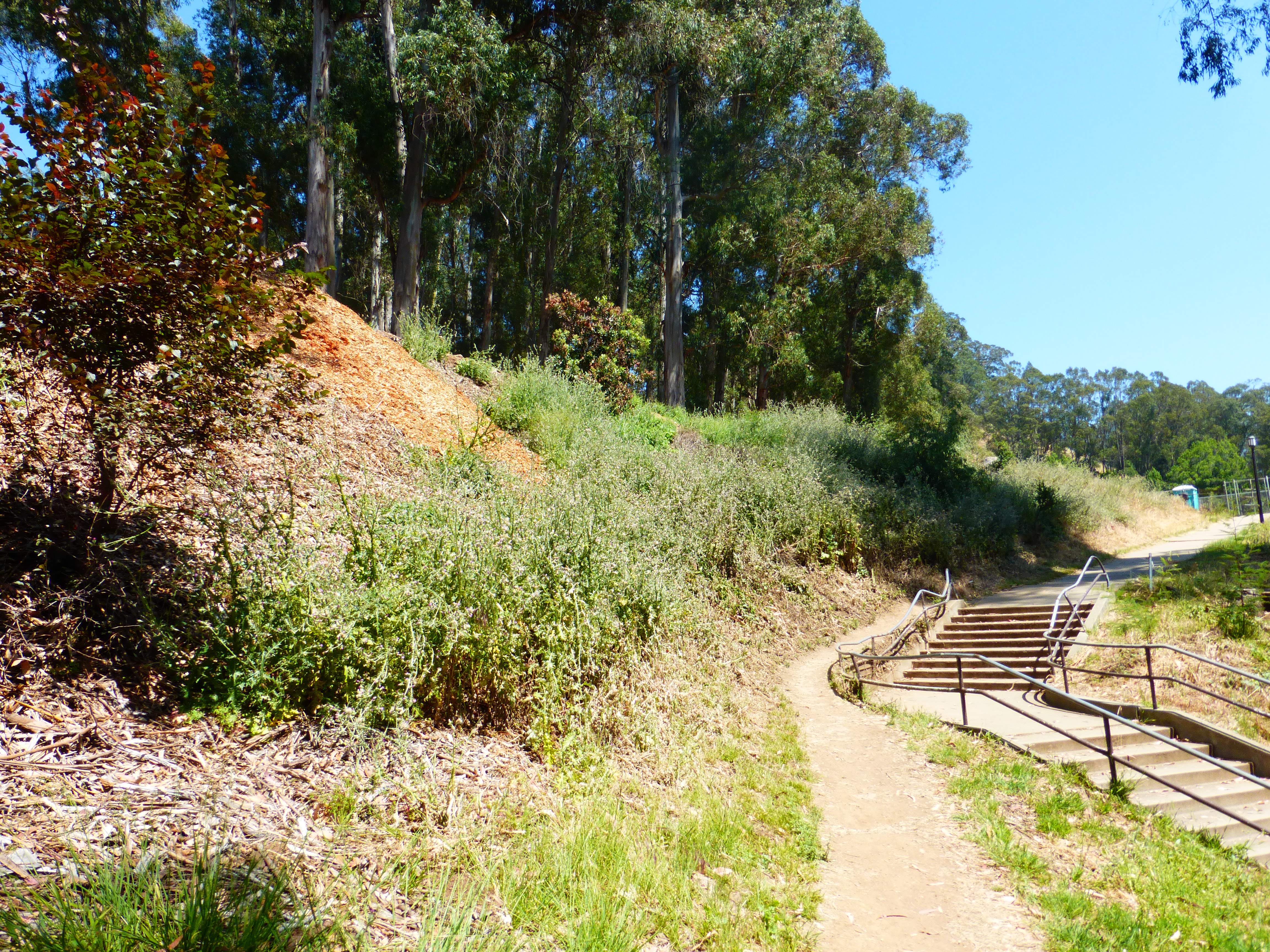 - The article claims that the 150 acres where UCB destroyed trees over 15 years ago are now covered in native trees and shrubs that “came in” on their own when the trees were destroyed. All of these areas are easily visited and observed. They are occupied by non-native weeds and piles of wood chips. Here is a picture of one of those areas taken on August 6, 2017.