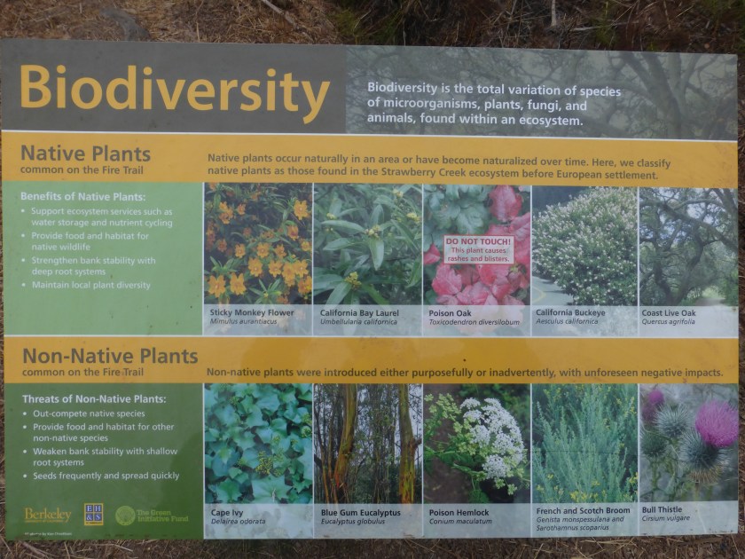 We learned of new “informational” signs along the fire trail in Strawberry Canyon in July 2017, but we don’t know precisely when they were installed. Those who often visit Strawberry Canyon tell us the signs are recent. This sign about “biodiversity” is an example of the message UCB is sending to the public.